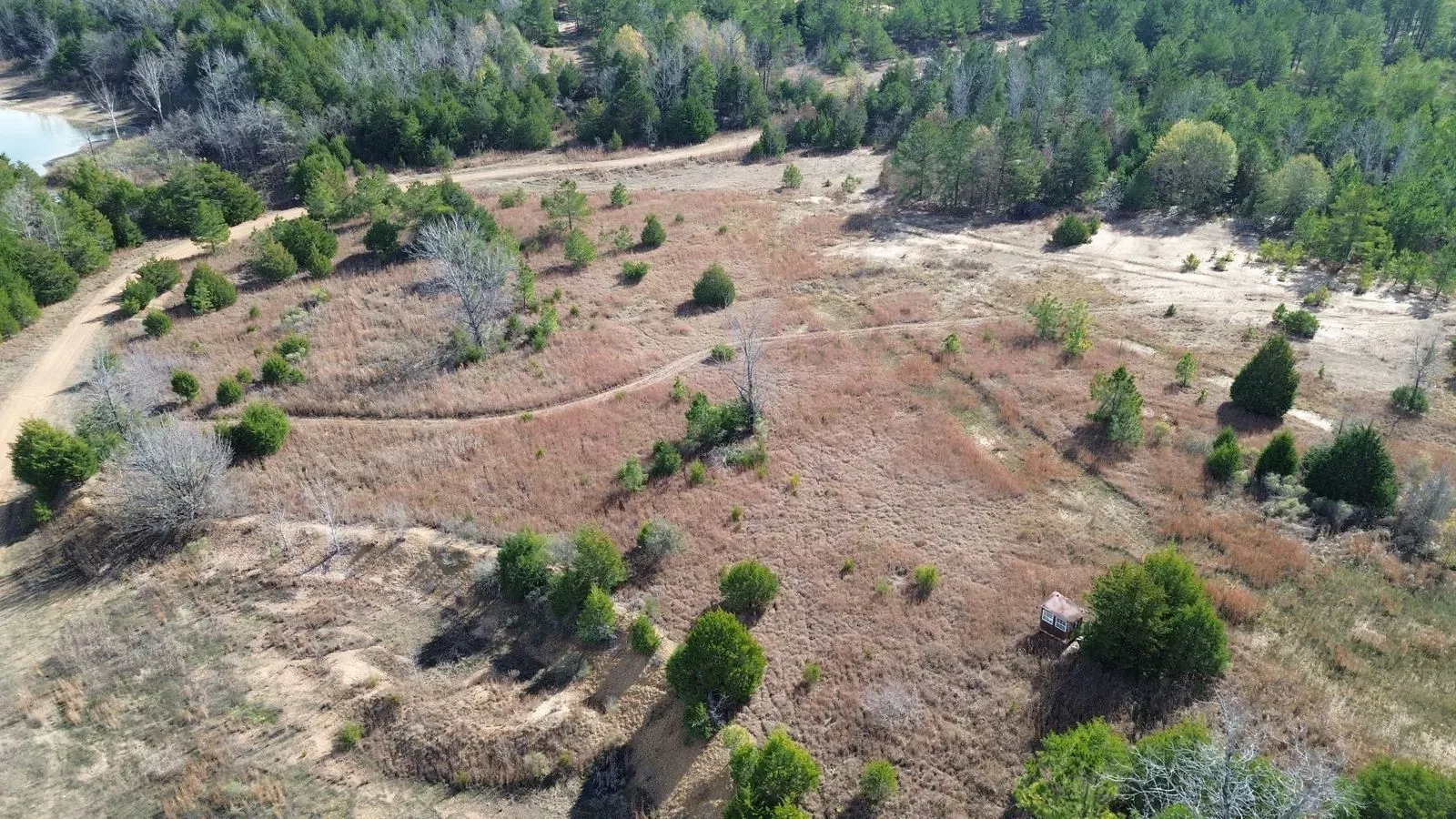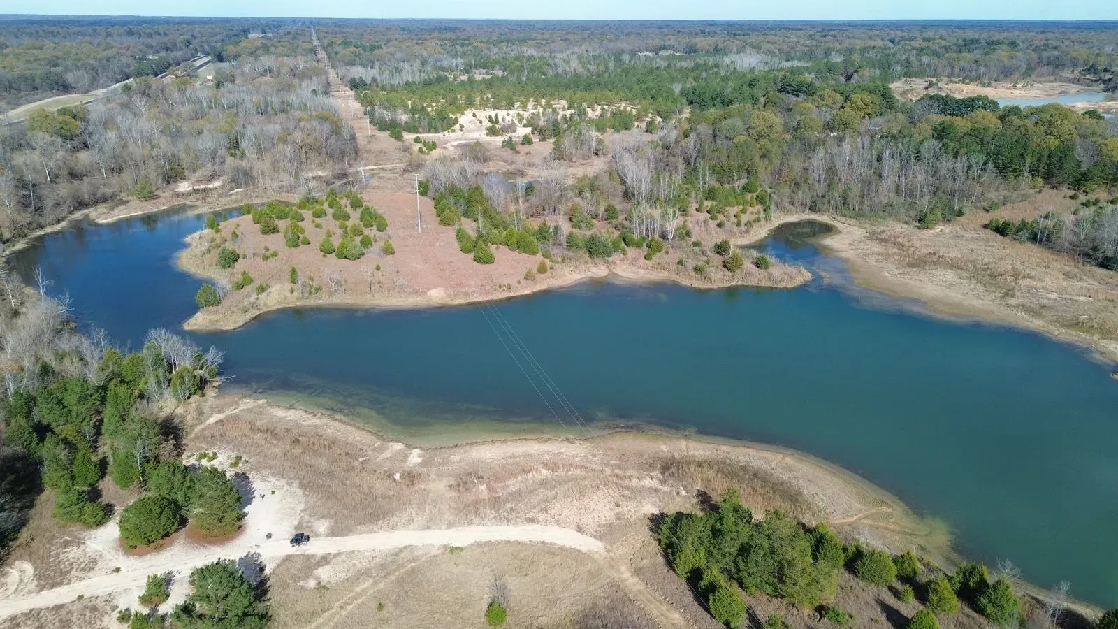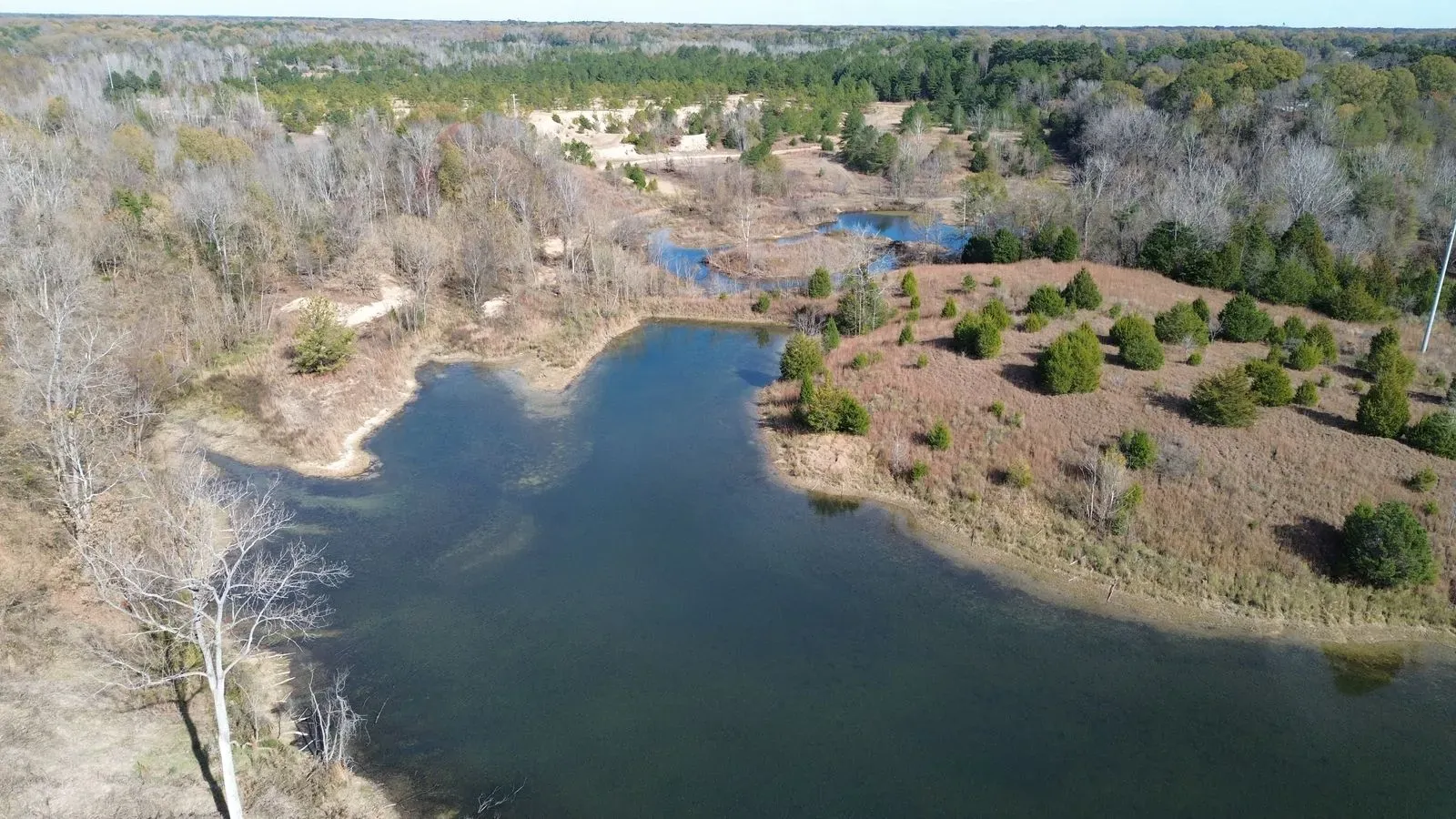Property consists of pine and scattered hardwood trees, thickets and two lakes
